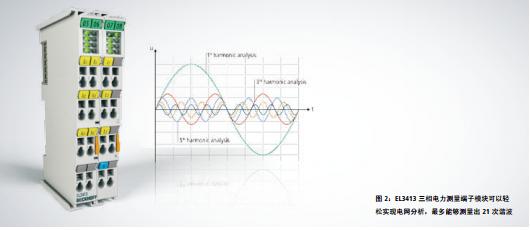 EL3413 三相電力測量端子模塊測試電壓高達(dá) 690 V AC(3 相,5 A),帶電氣隔離的電流輸入。由于集成了諧波震蕩計算功能,模塊最多能夠輕松進(jìn)行電網(wǎng)分析并測量出 21 次諧波(見圖 2)。由于測試電壓高達(dá) 690 V,它通常用于風(fēng)力發(fā)電機組應(yīng)用,例如 EL3403 適合用于監(jiān)控風(fēng)力發(fā)電機組的并網(wǎng)情況。