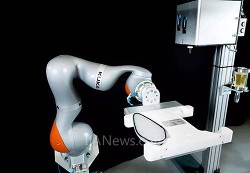 當(dāng)進(jìn)入到 GPS 天線頂蓋黏合工序時(shí),裝配工用人工方式將工件放置在機(jī)器人抓手上。抓手將工件裹住并將工件移動(dòng)至應(yīng)用塔上的黏合劑噴嘴處。KUKA LBR iiwa 型機(jī)器人將 GPS 天線頂蓋緩慢的移動(dòng)至黏合劑噴嘴處。