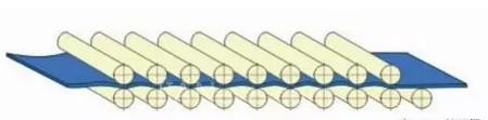輥式整平機(jī)工作時(shí)主要是靠上下輥筒錯(cuò)位間隙來完成對(duì)彎曲板材的矯正,當(dāng)板材被送入上下輥之間時(shí),分別使板料向上和向下彎曲,鋼板經(jīng)過多次的拉伸彎曲后,原來張力較大的部位被拉伸,消除內(nèi)部應(yīng)力,達(dá)到矯正和整平的目的。