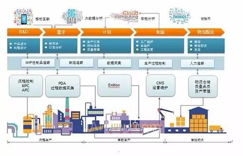 如果說(shuō)我把整個(gè)我們和智能制造有關(guān)系的,做一個(gè)大的圖像的描述的話,大家可以看到,整個(gè)的構(gòu)架分三個(gè)部分,一部分是流程的生產(chǎn),再一個(gè)是離散化生產(chǎn),再一個(gè)是智能物流,這幾個(gè)有關(guān)系的,和數(shù)據(jù)采集和人員監(jiān)控,設(shè)備的監(jiān)控,也就是故障早期診斷系統(tǒng),CMS等等,一直包括流程在線的追蹤監(jiān)控,缺陷追蹤,所有這些都是和智慧工廠、智能制造有關(guān)系的。