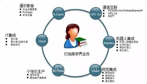 對(duì)于教育,首先我們強(qiáng)調(diào)通識(shí)教育,包括PLCopen、軟件工程、機(jī)電工程思想這些通識(shí)性全局性的思想,因?yàn)橹悄苤圃焓且粋€(gè)系統(tǒng)全局的工程,必須與之相匹配的技能模型。作為智能制造業(yè)協(xié)會(huì)教育分會(huì)的發(fā)起者,貝加萊積極的推動(dòng)職業(yè)教育的發(fā)展,因?yàn)檫@關(guān)系到智能制造的發(fā)展,未來(lái)的制造業(yè)人才需求更為偏重于ICT技術(shù)的知識(shí)與應(yīng)用技能如OPC UA、云計(jì)算、邊緣計(jì)算等,在機(jī)電工程方面也會(huì)擴(kuò)展到機(jī)器人、視覺(jué)以及機(jī)器人集成、3D打印等技術(shù)領(lǐng)域的知識(shí)技能。