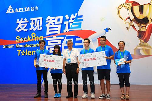 圖一 臺達董事長海英俊為特等獎獲得者臺灣中原大學“天下萬物不求人”團隊以及合肥工業(yè)大學“斛兵”團隊頒獎