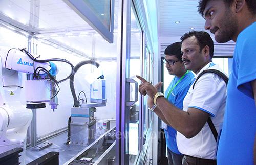 圖六 首次參加“臺達杯”高校自動化大賽的印度團隊饒有興趣的參觀臺達吳江自動化產(chǎn)線