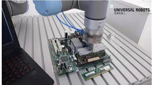 為了滿足企業(yè)對柔性裝配的基本需求,優(yōu)傲機(jī)器人(UR)(AHTE 2017展位號:E3-B12)也推出了“力傳感器+協(xié)作機(jī)器人”的創(chuàng)新性解決方案。在該解決方案中,協(xié)作機(jī)器人相當(dāng)于人的手臂,力傳感器和夾爪則相當(dāng)于人的手指。而配有力傳感器和夾爪的UR機(jī)器人,可通過觸碰調(diào)整進(jìn)行精準(zhǔn)定位后,使用與人體手指相似的力度成功實現(xiàn)內(nèi)存條的柔性裝配。即使物料存在大于±0.5mm安裝公差時,優(yōu)傲機(jī)器人的精準(zhǔn)力控方案同樣可以成功組裝,無需視覺等定位輔助。