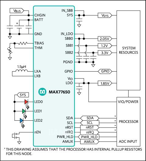 MAX77650和MAX77651采用單電感多輸出(SIMO) buck-boost架構(gòu),憑借單個電感提供三路電源輸出,結(jié)合150mA LDO和三路灌電流驅(qū)動器,大大減少元件數(shù)量,最大程度地增大電路板可用空間。為提高設(shè)計靈活性,MAX77650和MAX77651分別支持最高3.3V和5V工作電壓 — 兩款器件均包括一個多路復(fù)用(MUX)輸出,確保可靠地監(jiān)測電池電壓,理想用于低功耗設(shè)計。
