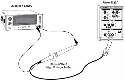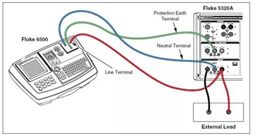 ▲ 步驟2:按測試泄漏電流模式連接耐壓測試儀、負載電阻和5320A的電流表和電壓表,必要時選擇Probe,用分壓器擴大電壓測量范圍