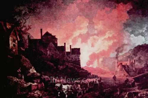 英國畫家德盧戴爾布格筆下的工業(yè)革命:山區(qū)小鎮(zhèn)的煉鐵廠飛濺的火花照亮了夜空 圖/財新網