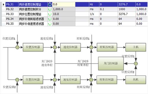 如下圖所示,龍門同步控制器會實時讀取主機與從機的位置信號,從而得出主機與從機的位置與速度差值,然后輸出速度與轉(zhuǎn)矩補償指令,以達到主機與從機同步運行的效果。