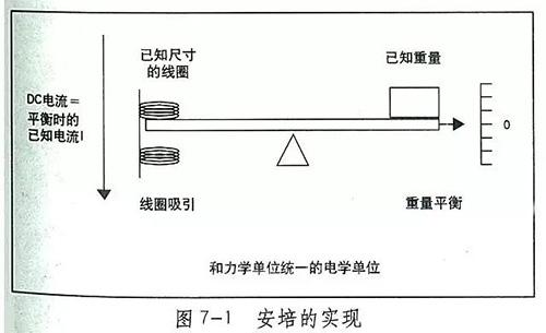 在這個簡化的圖中,位于天平臂左邊的線圈的磁場產生一個與流過的電流及每個線圈的圈數成正比的吸引力。該吸引力為位于天平臂右邊的重物所平衡。在IEEE儀器與測量學報(IEEE transactions on Instrumentation and Measurement)1985年6月號上發(fā)表的NIST在實驗中使用的實際設備比這個圖要更加復雜。