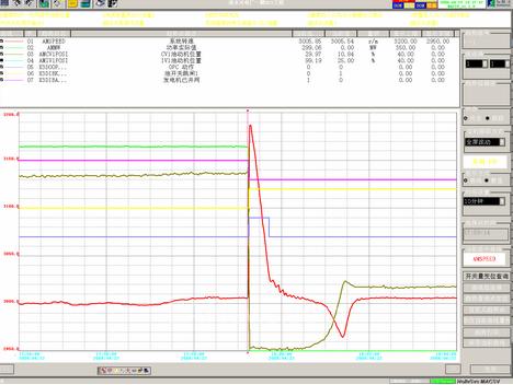 此DEH只在油開關(guān)斷開期間保留了103%超速限制功能,因此不會出現(xiàn)上述振蕩。同時增加了判斷加速度大輸出OPC功能,使機組在各種甩負(fù)荷工況下具有良好的動態(tài)特性,經(jīng)過一次振蕩即能達(dá)到穩(wěn)態(tài)。圖7所示為甩100%負(fù)荷時的轉(zhuǎn)速曲線圖。