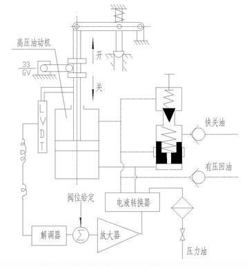 連續(xù)控制油動機與DEH的伺服模塊配合可使閥門定位在全開全關(guān)之間任何位置。如圖4所示,在快關(guān)油(或安全油)建立期間,油動機受伺服閥控制。在伺服模塊中閥位給定電壓與反映油動機行程的LVDT反饋電壓進(jìn)行比較,經(jīng)比例放大后輸出給伺服閥。伺服閥根據(jù)控制信號的大小及方向控制作油動機開啟或關(guān)閉的速度。油動機行程到達(dá)給定值時,伺服閥處于斷流位置,油動機行程維持不變。