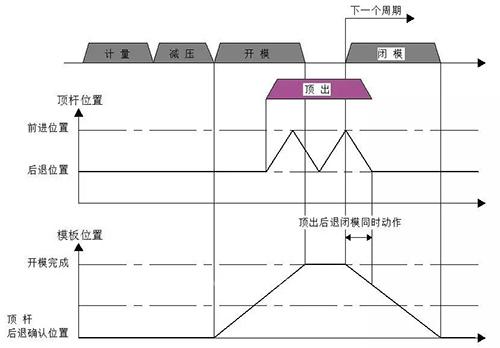 該功能是在最后一次頂出前進(jìn)完成后,開(kāi)始閉模,閉模中頂桿后退,實(shí)現(xiàn)頂桿后退與閉模動(dòng)作重疊,實(shí)現(xiàn)縮短周期時(shí)間的目的。