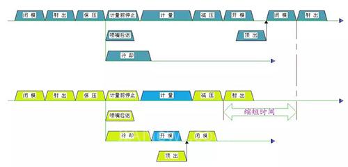針對(duì)計(jì)量時(shí)間較長(zhǎng)的成型工藝,可以冷卻后直接開(kāi)模,實(shí)現(xiàn)開(kāi)模動(dòng)作與計(jì)量動(dòng)作重疊,實(shí)現(xiàn)縮短周期的目的。