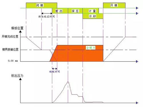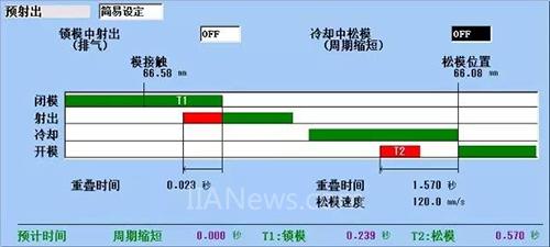 預(yù)射出功能除可以實(shí)現(xiàn)模板壓縮成型功能外,還可以實(shí)現(xiàn)鎖模與射出部分重疊、冷卻與松模部分重疊,實(shí)現(xiàn)周期縮短的目的。