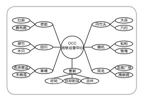 全線共22個車站,軸心站9個,衛(wèi)星站13個,中央控制室位于地鐵運(yùn)營中心(OCC),如下圖: