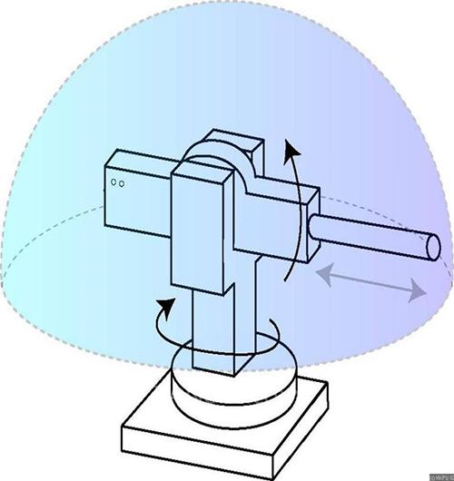 如圖2,C是這個(gè)臂的回轉(zhuǎn)中心,這個(gè)臂可以伸長(zhǎng)和縮短,回轉(zhuǎn)中心也可以回轉(zhuǎn)。 這個(gè)動(dòng)作范圍應(yīng)該是一個(gè)空心球,由于手臂并不能理想的掃出一個(gè)圓,因此這個(gè)球是一個(gè)破損的球。這種結(jié)構(gòu)較其他各種結(jié)構(gòu)更容易伸入到上下傾斜的孔的內(nèi)部,當(dāng)又這種需求時(shí)應(yīng)優(yōu)先考慮球坐標(biāo)型機(jī)器人。
