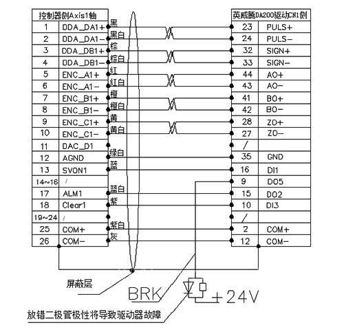 接線要求:系統(tǒng)到驅(qū)動(dòng)器連接要求采用雙絞 2*8 屏蔽電纜,抱閘系統(tǒng)電纜采用 1*2 屏蔽線連 接到抱閘制動(dòng)板上,外殼要與屏蔽層連接良好??刂破鱾?cè)的 AGND 必須跟伺服 的 GND 連接,否則可能會(huì)造成控制器硬件損壞。