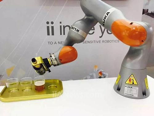 展會(huì)還有 KUKA 的 LBR iiwa 機(jī)器人,在現(xiàn)場(chǎng),它盡職的為每一位來(lái)賓倒上一杯啤酒,創(chuàng)新的七軸設(shè)計(jì)讓它能最大程度地模擬人手操作,在人機(jī)協(xié)作方面開(kāi)辟了一個(gè)全新的應(yīng)用領(lǐng)域,突破機(jī)器人以往無(wú)法跨越的界限,即使是極為特殊的要求,它也能應(yīng)對(duì)自如。
