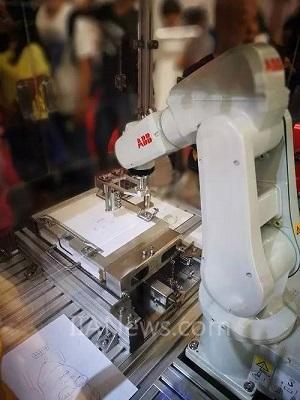 除了YuMi,現(xiàn)場(chǎng)的另一人氣展品就是IRB 120人臉識(shí)別及素描繪畫(huà)工作站。機(jī)器人手持筆桿,使用通用攝像頭對(duì)人臉進(jìn)行拍照,以內(nèi)置的人臉識(shí)別應(yīng)用程序?qū)⑷四樚卣髦底詣?dòng)轉(zhuǎn)換為路徑,并根據(jù)機(jī)器人運(yùn)動(dòng)程序的特點(diǎn)對(duì)運(yùn)動(dòng)路徑進(jìn)行優(yōu)化,形成最后的機(jī)器人手臂運(yùn)動(dòng)路徑后,在A4紙面上完成人臉的繪圖。