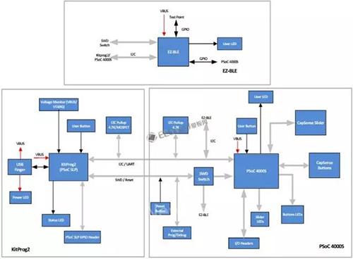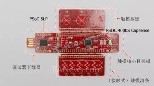 整個(gè)板子不大,按功能大致可以分為3個(gè)部分:分別是搭載核心器件PSoC 4 Capsense器件的目標(biāo)板;一個(gè)KitProg板載編程器和調(diào)試器以及還有兩塊電容性板。