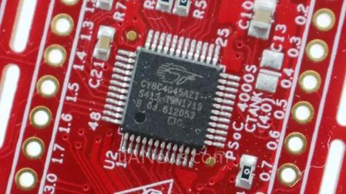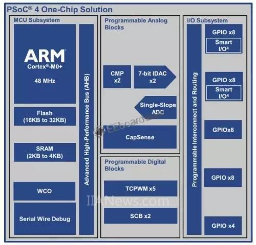板載的賽普拉斯PSoC 4000S CapSense觸摸控制器,具體型號(hào)為CY8C4045AZI-S413,基于ARM Cortex-M0+處理器,最大主頻為48MHz,內(nèi)部集成32KB FLASH、4KB SRAM,并支持1個(gè)10bt single-slope ADC、8個(gè)比較器、2兩個(gè)IDACs,5個(gè)定時(shí)器/計(jì)數(shù)器/PWM、2個(gè)串行接口、1個(gè) CapSense模塊,最大可支持36個(gè)GPIO口擴(kuò)展。