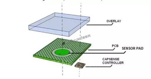 CapSense 觸摸感應(yīng)解決方案的硬件設(shè)計(jì)主要包括觸摸傳感器,PCB,保護(hù)組件(overlay),如下圖的結(jié)構(gòu)所示。