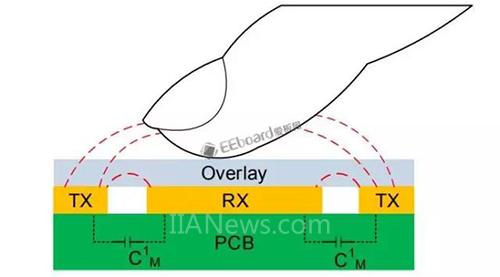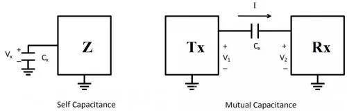 上圖中右側(cè)的圖則是互電容感應(yīng)技術(shù)的原理,互電容感應(yīng)將測量兩個(gè)電極間的電容,其中一個(gè)電極被稱為發(fā)送電極TX,另一個(gè)被稱為接收電極RX。