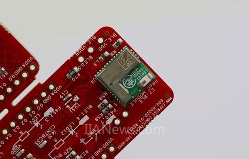 放大看一下,Cypress BLE PRoC模塊,具體型號(hào)為CYBLE-022001-00模塊,支持BLE 4.1協(xié)議棧,尺寸只有10mm*10mm*1.8mm,非常小,但是包含了ADC、定時(shí)器、計(jì)數(shù)器功能和支持PWM、I2C、UART、SPI外設(shè),可以通過PSOC的可編程架構(gòu)自己定義。