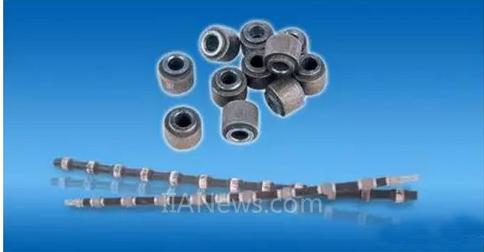 在串珠鋸切割系統(tǒng)中,作為切割刀具的串珠繩在實際切割中起著主導(dǎo)作用。從最早出現(xiàn)的、用于試驗切割石材、使用孕鑲金剛石串珠的串珠繩開始,對串珠繩的改進就從未停止過,尤其是對實際參加切削加工的金剛石串珠制備工藝的改進。金剛石串珠中各種物料的比例(配方),是根據(jù)石材的硬度和磨耗的分級確定的。燒結(jié)法是目前常用的串珠制造工藝。
