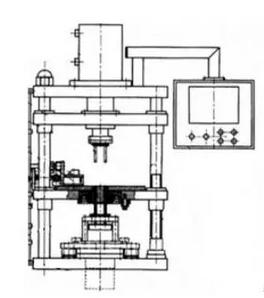 冷壓機由四立柱框架式結(jié)構(gòu)組成,模具的上壓頭安裝在上活動梁上,由上電機或油缸出力實現(xiàn)下壓動作。中模腔和給料裝置固定在中橫梁上,中橫梁和滾珠絲杠連接通過伺服電機驅(qū)動,實現(xiàn)中芯桿位置調(diào)節(jié)。下壓頭安裝在下電機或油缸的斷面,通過其出力來實現(xiàn)壓實和出料的動作。