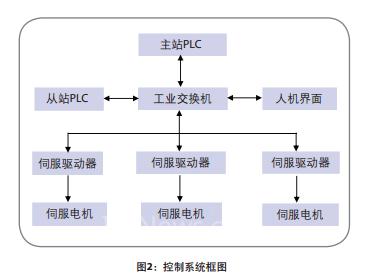 在系統(tǒng)的具體搭建上 , 采 用 ControlLogix 1756作為主站PLC, CPU選用1756-L72,通過以太網(wǎng)模塊1756-EN3TR將主站PLC與工業(yè)交換機(jī) ES-1026連接,再通過工業(yè)交換機(jī)與從站PLC、人機(jī)界面和伺服驅(qū)動器組成 Ethernet/IP工業(yè)以太網(wǎng)絡(luò),實(shí)現(xiàn)主站PLC 對整個(gè)控制系統(tǒng)進(jìn)行集中控制。其系統(tǒng)框圖如圖2所示。
