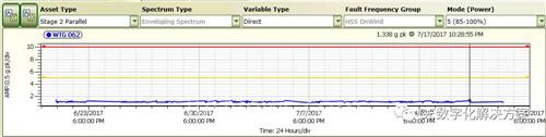 當(dāng)追蹤該位置的振動(dòng)時(shí),其振動(dòng)趨勢(shì)很平穩(wěn)與其它機(jī)組相比,幅值也不高,在1g至1.3g上下,如下圖所示: