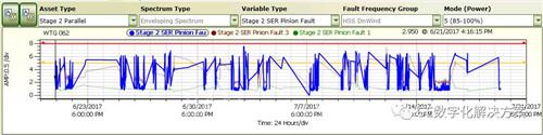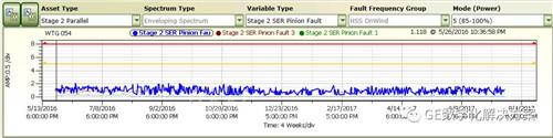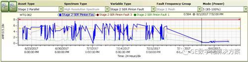 用戶(hù)在2017年7月24日至8月1日對(duì)中間軸小齒輪進(jìn)行更換處理,隨后開(kāi)機(jī)運(yùn)行,檢查第2平行級(jí)SER指數(shù),此時(shí)指數(shù)明顯低于齒輪更換前,見(jiàn)下圖紅色框中趨勢(shì)值。