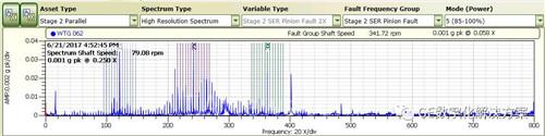 因?yàn)樵摍C(jī)組只是從6月份開(kāi)始進(jìn)行監(jiān)測(cè),以前的數(shù)據(jù)無(wú)從對(duì)比。所以最好的方式是進(jìn)行相同型號(hào)機(jī)組之間的比較。當(dāng)檢查其各個(gè)參數(shù)時(shí),發(fā)現(xiàn)其2XGMF(藍(lán)色曲線)與3XGMF(棕色曲線)兩側(cè)的邊帶能量率比其它機(jī)組更大,參考下面的圖形: