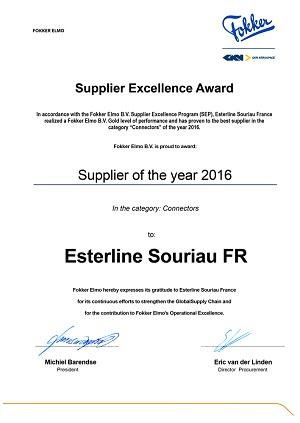 Esterline Connection Technologies SOURIAU - SUNBANK總裁Patrice Cavelier-Bros非常榮幸能獲得2016最佳連接器供應商獎。他在閉幕式時總結道:“能在Souriau百年之際在巴黎航展上獲此殊榮,我們感到非常自豪。我將與SOURIAU整個團隊分享這份榮譽,這是我們日復一日共同努力的成果,也是對我們最高水平生產、管理及交付高品質產品的一種肯定。我們與??说牧己藐P系是雙方合作的要素之一,如果質量問題出現(xiàn),我們不會推卸責任,我們會向合作伙伴了解問題的根源并制定解決方案。這是SOURIAU的企業(yè)精髓,也是我們的創(chuàng)新之本。在過去幾年里,我們一直在與??吮3謨晌粩?shù)增長,我們還將盡一切努力實現(xiàn)更大增長。
