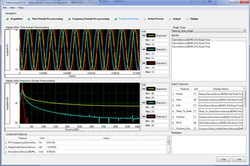 ● 用戶欲建置量測系統(tǒng),首先需觀察并驗證傳感器訊號。本模式可協(xié)助用戶分析訊號,并提供類似示波器之功能─包括光標測量工具、觸發(fā)采集功能、振幅、頻率、平均值和峰對峰值之自動量測功能,以及時域數(shù)據(jù)和頻譜圖的實時顯示。