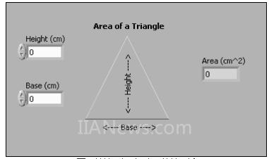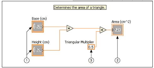 輸入控件、顯示控件和常量用作程序框圖算法的輸入和輸出。以計(jì)算三角形面積算法為例: