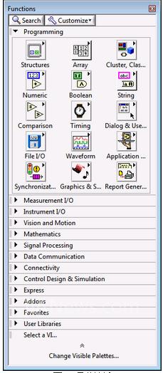 函數(shù)選板中包含創(chuàng)建程序框圖所需的VI、函數(shù)和常量。在程序框圖中選擇“查看?函數(shù)選板”可打開(kāi)函數(shù)選板。函數(shù)選板包含許多類別,可根據(jù)需要顯示或隱藏。圖11是一個(gè)包含全部類別的函數(shù)選板,其中的“Programming”(編程)類別展開(kāi)顯示。