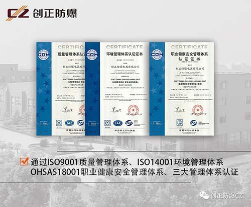 2017年8月2日至4日,經過方圓認證標志集團有限公司專家的嚴格審核,創(chuàng)正防爆電器有限公司再次成功通過了國家三標一體認證,即ISO9001質量管理體系、 ISO14001環(huán)境管理體系和OHSAS18001職業(yè)健康安全管理體系等三標一體認證。