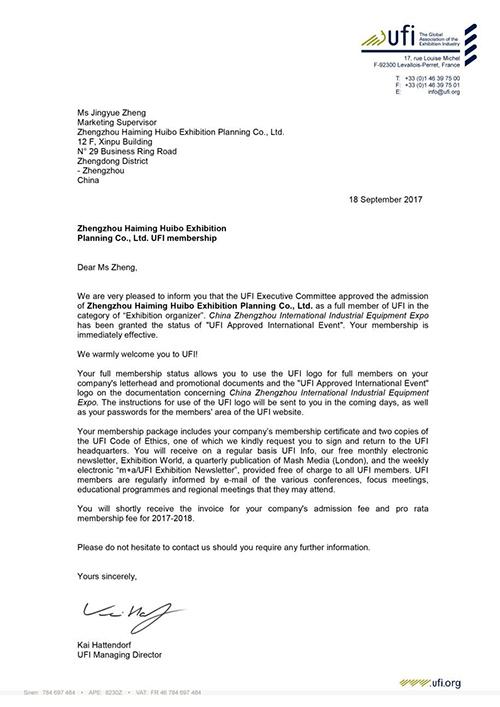 2017年9月13日,UFI(全球展覽業(yè)協(xié)會)巴黎總部傳來喜訊:中國鄭州國際工業(yè)裝備博覽會(簡稱“鄭州工博會”)正式通過UFI認(rèn)證,展會承辦方鄭州海名匯博會展策劃有限公司也通過UFI評審委員會的表決,正式成為UFI會員單位。