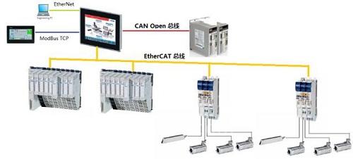 在本套方案中,控制軸包括刀頭電機(jī)、煙槍布袋輪、接收輪、加速輪、開(kāi)松輥、甘油電機(jī)等運(yùn)動(dòng)原件。刀頭電機(jī)和接收輪要求相位同步,開(kāi)松輥和煙槍布袋輪要求速度同步,并且在手動(dòng)盤(pán)車(chē)時(shí)接收輪要跟隨主電機(jī)運(yùn)行,其余電機(jī)都停止。上位機(jī)由p500實(shí)現(xiàn),p500通過(guò)EPM-S130掛IO端子。p500作為主屏,另外還有個(gè)付屏,采用施耐德的低端屏與p500進(jìn)行ModBusTcp通信,用于修改和顯示開(kāi)松輥的速度。熱膠和冷膠控制精度較低,采用KinCo的控制器進(jìn)行控制,與主控p500通過(guò)CAN Open通信進(jìn)行連接。電氣系統(tǒng)結(jié)構(gòu)圖如下圖。