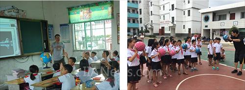 日立志愿者在講授世界地理 日立志愿者在教授籃球知識