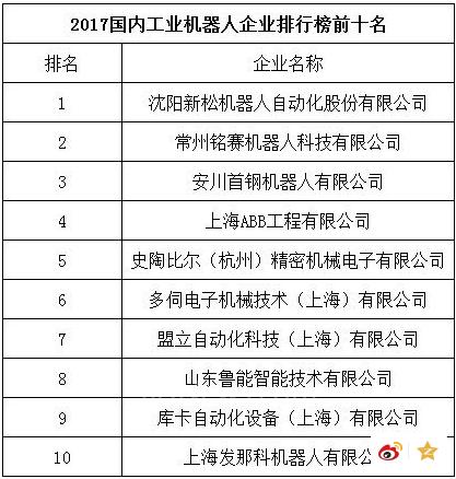 2017年國內(nèi)工業(yè) 機器人企業(yè) 排行榜前十名(來自互聯(lián)網(wǎng)周刊及eNet排名)