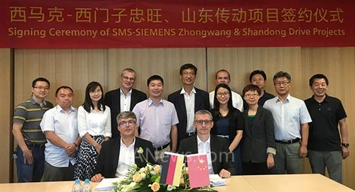 西馬克集團電氣/自動化業(yè)務執(zhí)行副總裁Bernward Reif(左前)與西門子股份公司冶金、能源及其他行業(yè)驅動應用業(yè)務副總裁Sven-Michael B?hm(右前)簽訂協(xié)議,為中國多家鋁廠提供來自西門子的傳動技術產品