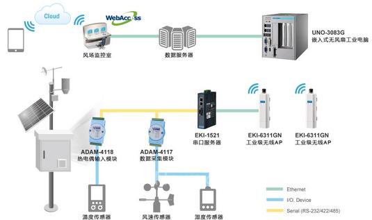 第一層,是最貼近設(shè)備的研華強固型數(shù)據(jù)采集模塊ADAM-4117 和ADAM-4150,實時采集風(fēng)場溫度、濕度、風(fēng)速、風(fēng)向及其他氣象儀表等關(guān)鍵氣象參數(shù);