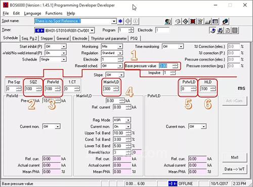 首先我們先討論一下博世控制器的分段壓力使用的一些要領(lǐng):在程序界面完成諸如焊接壓力、焊接電流及已焊接時(shí)間等工藝參數(shù)的設(shè)定,這里需要注意的是焊接時(shí)間是預(yù)壓時(shí)間 SQZ、預(yù)熱 Preweld、主焊接 MianWLD、后熱 PstWLD、保持 HLD 和各段冷卻時(shí)間的總和。