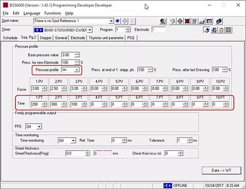 然后,我們選擇打開程序2界面,激活分段壓力“ Pressure Profile ”功能。博世焊接控制器一共為大家提供了10段自由編輯焊接壓力和時(shí)間的功能選項(xiàng),用戶可以根據(jù)需求選擇其中的幾段或者全部使用。并且設(shè)置焊接時(shí)間的總和需要與程序1界面設(shè)置的相一致,如果超過(guò)焊點(diǎn)設(shè)定的焊接時(shí)間,控制器會(huì)在 HLD 保持時(shí)間結(jié)束后,停止輸出壓力信號(hào)。