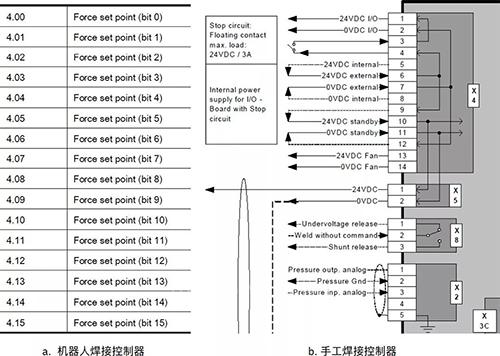 為了滿足各大汽車廠商的生產(chǎn)需求,博世焊接控制器針對(duì)機(jī)器人焊接控制器和手工焊接控制器開發(fā)了不同的分段壓力響應(yīng)的機(jī)制:a. 針對(duì)機(jī)器人焊接控制器,我們通過(guò)現(xiàn)場(chǎng)總線(例如 Profinet 總線)將變壓力信號(hào)輸出到機(jī)器人控制伺服電機(jī)實(shí)現(xiàn)。b. 針對(duì)手工焊接控制器,我們通過(guò)硬接線模擬量信號(hào)(控制器主板上的 X2 端子)將變壓力信號(hào)輸出到比例閥控制氣缸實(shí)現(xiàn)。