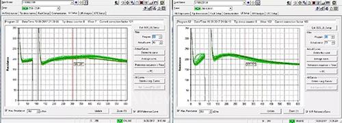 通過(guò)優(yōu)化焊接參數(shù),啟用分段壓力的焊接工藝,可以對(duì)比左邊(無(wú)分段壓力設(shè)置)和右邊(有分段壓力設(shè)置)動(dòng)態(tài)電阻曲線,明顯發(fā)現(xiàn)右圖的焊點(diǎn)焊接質(zhì)量(焊核)提高,整個(gè)焊接過(guò)程更加穩(wěn)定,同時(shí)外部電極磨損也下降。
