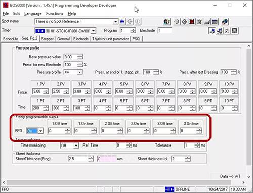 在 Bos6000 軟件程序2界面激活“ FPO 自由編程輸出 ”功能,F(xiàn)PO 的輸出信號(hào)可以用于控制各類外在附加設(shè)備。此信號(hào)可以為相關(guān)程序自由定義輸出,從預(yù)壓 SQZ 開始至保持 HLD 結(jié)束??梢栽谡麄€(gè)焊接工藝過(guò)程中,改變3次開關(guān)。與分段壓力功能相同,如果設(shè)置的時(shí)間超過(guò)整個(gè)焊接過(guò)程的總時(shí)間。將在焊接保持時(shí)間結(jié)束后,自動(dòng)重置 FPO 信號(hào)。